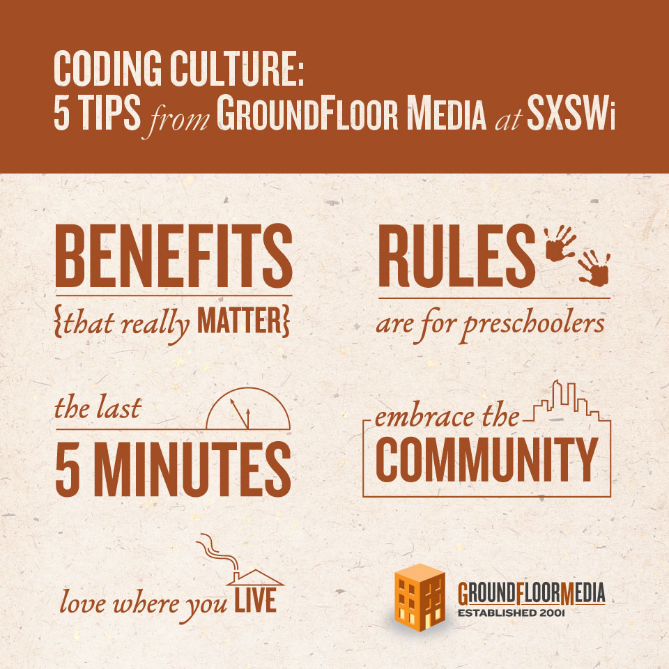 The Denver Business Journal seven years in a row as one of the top five companies to work for in Denver. While we make no claims about being the experts on culture, over time we’ve found out what works for us, and we love sharing our good, our bad and our “are you kidding me?” stories with others across the country. As always, we love to hear from others, as well, about what makes their cultures unique, and we were excited to learn a few new tips during SXSWi. Please feel free to send us an email (pr at groundfloormedia.com) to share your best stories (or missteps) with us.